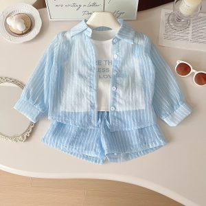 Girls’ Summer New Korean Style Long Sleeve Shirt Vest Shorts Three-piece Set