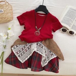 2025 Summer Girls’ Leaky Waist Short-sleeved Lace Plaid Skirt for Baby Girls’ Ethnic Style Two-piece Set